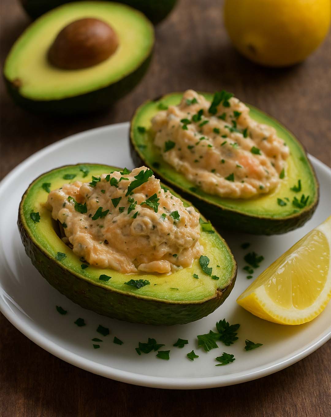 Préserver la fraîcheur de l’avocat : Pour éviter que les avocats ne noircissent après les avoir coupés, vous pouvez frotter la chair avec un peu de jus de citron ou de lime avant de les farcir. Le jus de citron aide à conserver la couleur verte de l’avocat et ajoute une touche de fraîcheur.