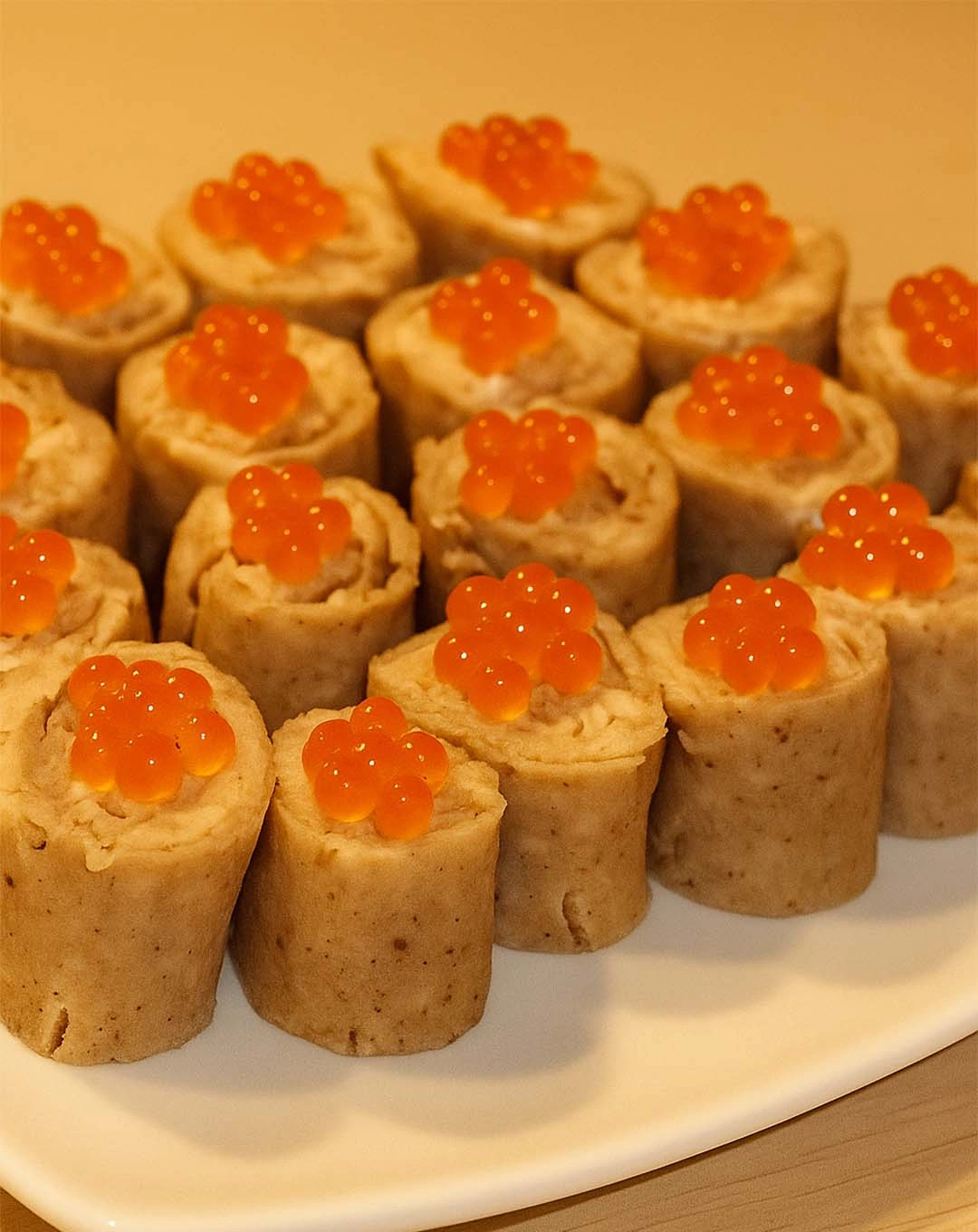 Une fois les rouleaux bien fermes, retirez le film alimentaire et coupez-les en tranches d’environ 1,5 cm d’épaisseur. Disposez les bouchées sur un plat de service, puis décorez chacune d’un petit dôme d’œufs de saumon pour une touche festive et raffinée. Servez très frais : une présentation parfaite pour un apéritif chic, un buffet de Noël, ou tout autre événement gourmand.