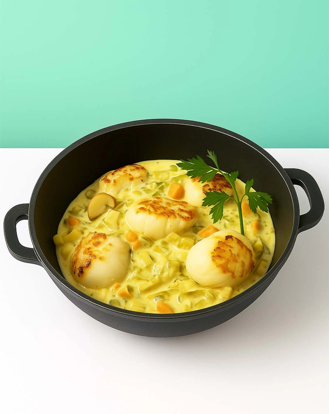 Pour une présentation encore plus raffinée, servez cette préparation dans des cassolettes individuelles. Les pâtes fraîches forment un lit onctueux, les Saint-Jacques dorées y reposent comme des bijoux de la mer, et la sauce nappée par-dessus crée un contraste de textures et de couleurs qui met l’eau à la bouche.