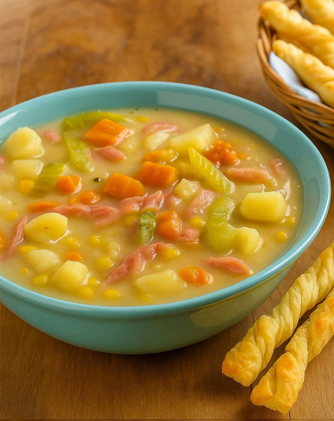 Quand les journées raccourcissent et que le froid s’installe, rien de plus réconfortant qu’une chaudrée d’automne maison. Cette soupe riche et onctueuse, à mi-chemin entre le potage et le ragoût, est un véritable concentré de chaleur et de saveurs. Préparée avec des pommes de terre fondantes, des patates douces, du maïs croquant et de délicieux morceaux de jambon fumé, elle séduit par son parfum délicat et sa texture crémeuse. C’est une recette généreuse et nourrissante, parfaite pour les repas en famille ou entre amis.