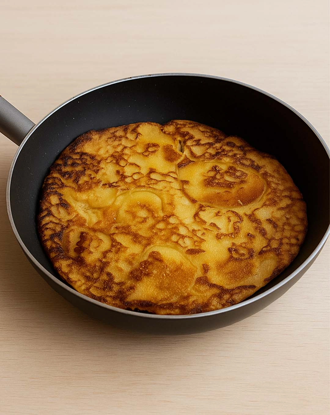 Versez ensuite une grosse louche de pâte dans la poêle chaude, en veillant à bien répartir les lamelles de pommes sur toute la surface. Étalez délicatement la pâte pour former une crêpe bien épaisse et uniforme. Laissez cuire environ deux minutes, jusqu’à ce que la surface commence à se figer et que le dessous soit bien doré. Retournez délicatement la crêpe alsacienne aux pommes à l’aide d’une assiette ou d’une spatule large — elle est trop consistante pour être retournée en la faisant sauter — puis laissez cuire l’autre face pendant une à deux minutes supplémentaires.