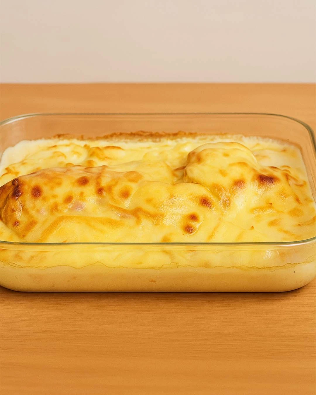 Ce gratin savoyard revisité séduit par sa simplicité et son authenticité. Facile à préparer, il demande peu d’ingrédients mais mise tout sur la qualité : du bon jambon blanc, un fromage savoyard bien affiné et une escalope de veau moelleuse. La cuisson au four lui confère une texture gratinée irrésistible qui met en appétit dès la première odeur.