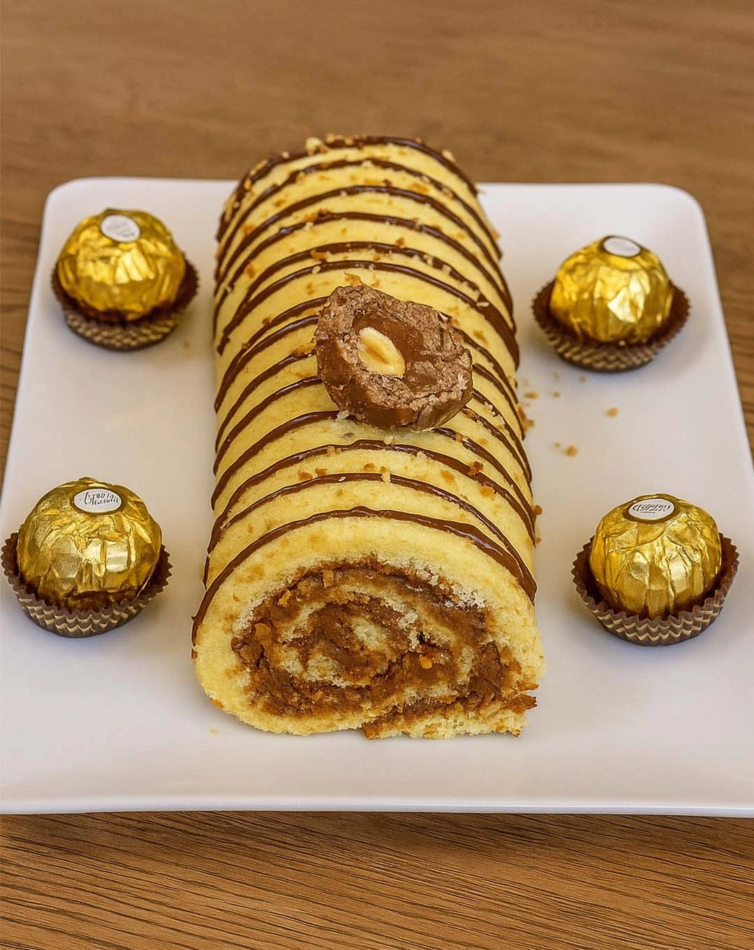 L’atout charme de cette recette, c’est sa décoration au Ferrero Rocher et au chocolat au lait fondu, qui rappelle les saveurs emblématiques de ces petites douceurs dorées. Un simple filet de chocolat, quelques noisettes concassées ou une touche de sucre glace suffisent à transformer ce gâteau roulé en une véritable bûche de Noël gourmande et festive.
