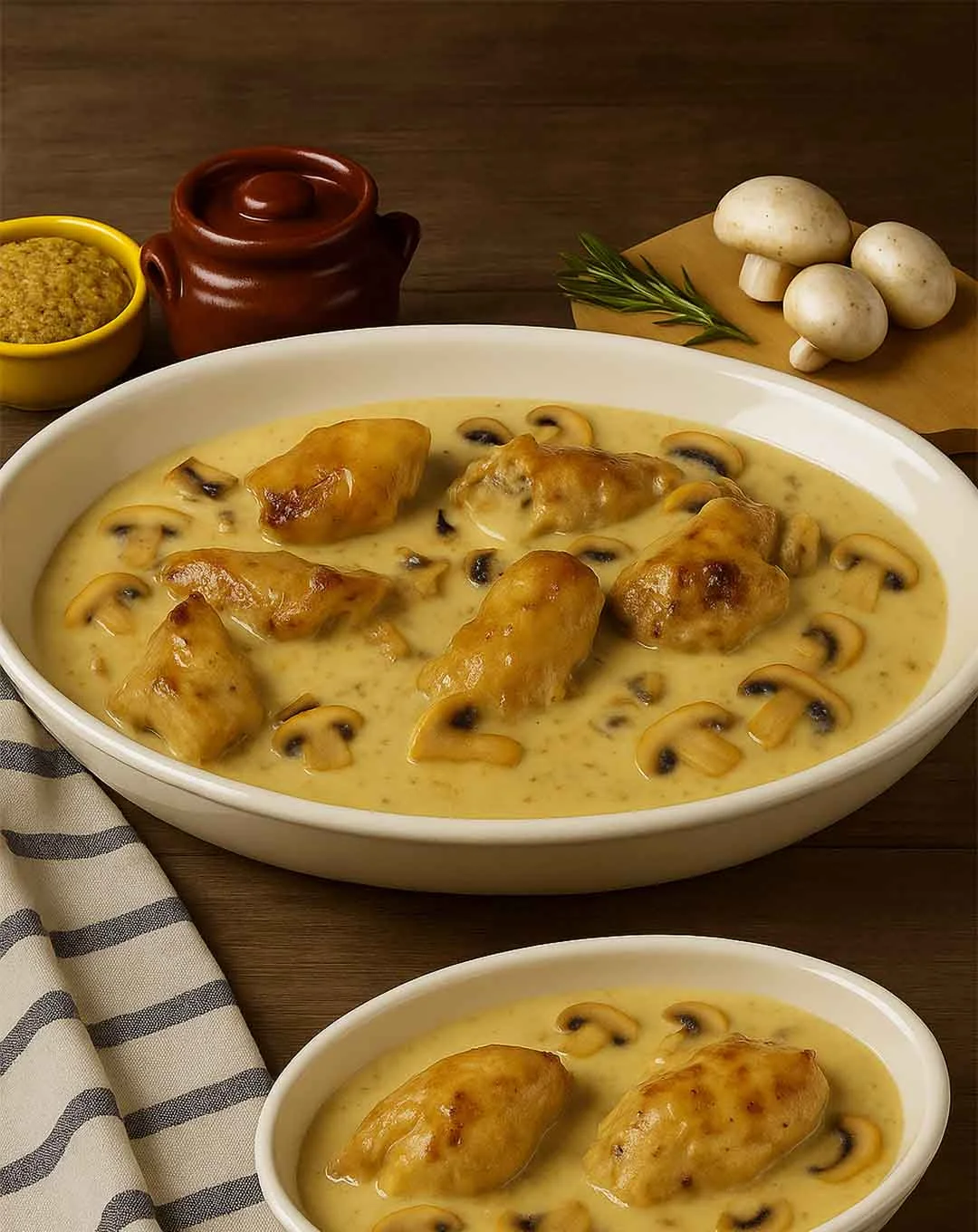Accompagnements idéaux : ce plat se marie à merveille avec des pâtes fraîches, du riz basmati ou des pommes de terre vapeur, qui absorberont parfaitement la sauce crémeuse.