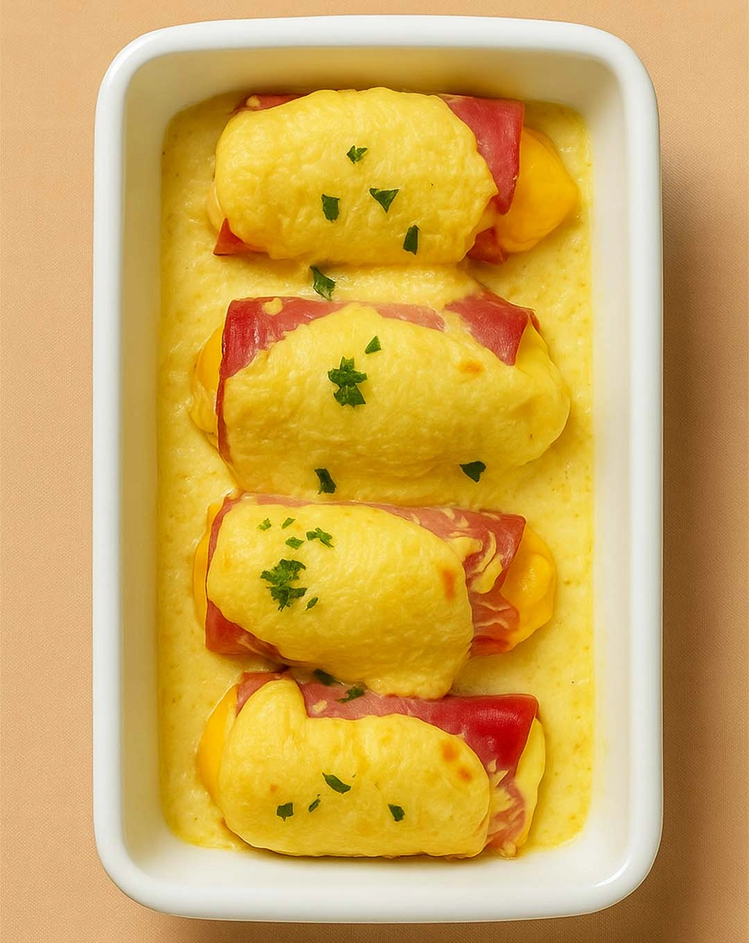 Versez la moitié de la béchamel dans un plat allant au four, disposez-y les rouleaux de jambon garnis, puis nappez-les du reste de sauce. Saupoudrez généreusement de gruyère râpé. Faites cuire au four à 200 °C pendant environ 25 minutes, sans préchauffage, jusqu’à ce que le dessus soit bien doré.