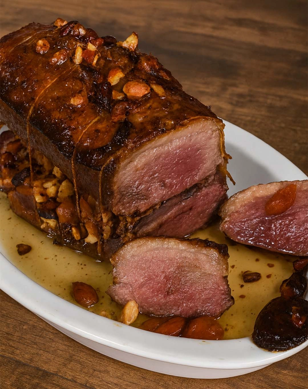 À la sortie du four, laissez le rôti de canard reposer 10 minutes sous une feuille d’aluminium afin que les jus se répartissent harmonieusement dans la viande. Tranchez délicatement et servez ce rôti de magrets de canard au miel et fruits secs, parfait pour un repas festif, un menu de Noël ou une occasion spéciale.