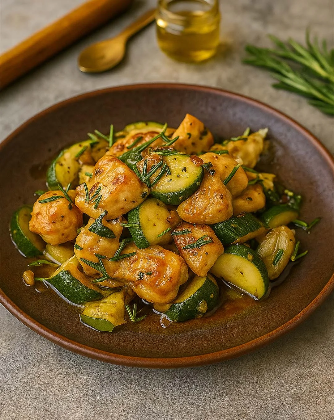 Version végétarienne : Remplacez le poulet par du tofu ferme coupé en dés, légèrement doré à la poêle avant d’ajouter les courgettes et la sauce soja. Vous pouvez aussi opter pour du seitan ou du tempeh, qui se marient très bien avec cette sauce.
