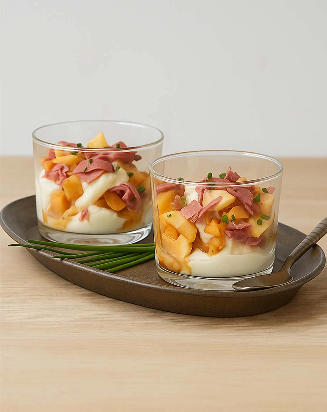 Verrines au fromage frais et magret fumé : remplacez la ricotta par du fromage de chèvre frais ou du mascarpone fouetté pour une texture plus riche et onctueuse. Ces fromages se marient parfaitement avec la pomme et le canard fumé.