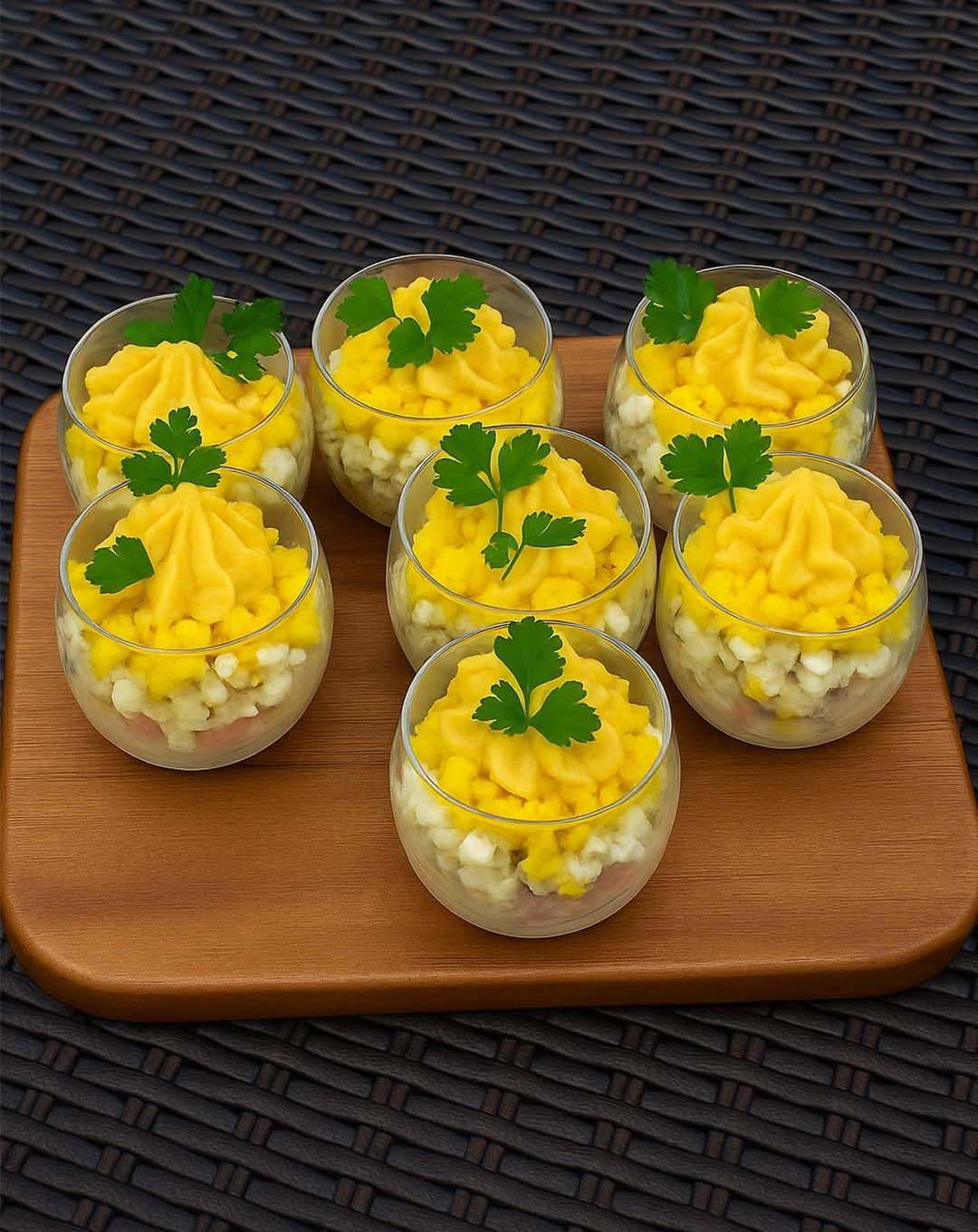 Les verrines d’œufs mimosa et jambon sont une idée d’apéritif simple, élégante et pleine de fraîcheur pour sublimer vos repas de fête. Leur présentation en petites portions individuelles permet de régaler vos invités avec une touche de gourmandise et de raffinement. Ces verrines salées associent la douceur des œufs mimosa à la saveur fumée du jambon, pour une bouchée à la fois fondante et équilibrée.