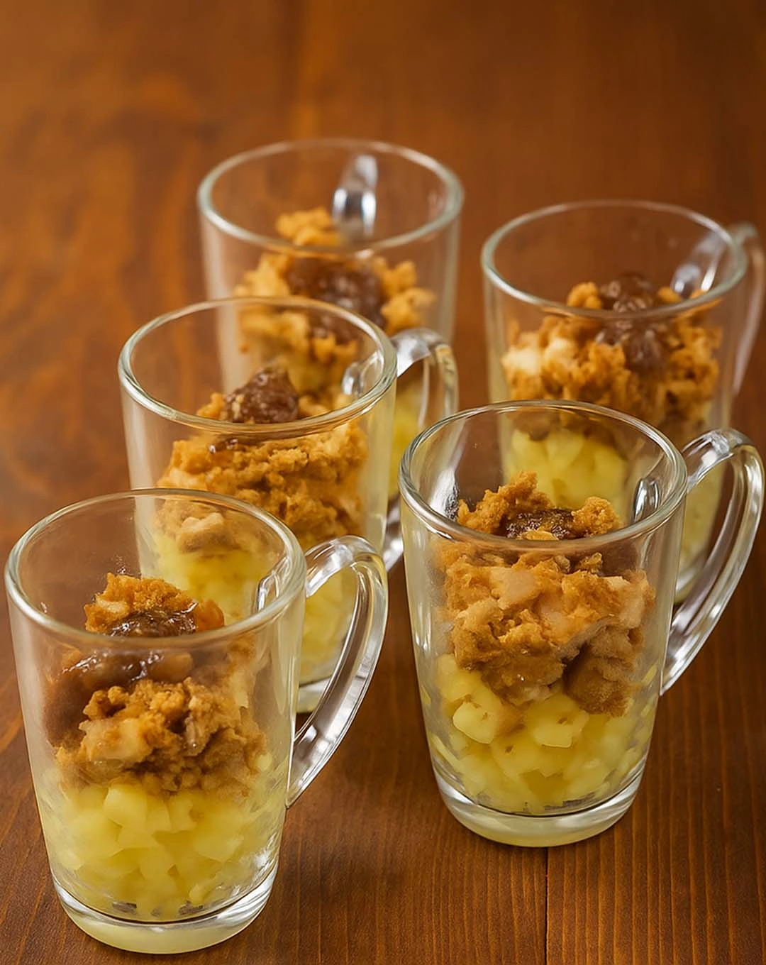 Des verrines en verre permettent de mettre en valeur les différentes couches : pommes dorées, foie gras fondant, pain d’épices et confit. Un atout visuel essentiel pour un apéritif chic et gourmand.